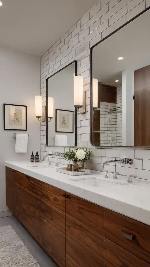 This look works especially well in bathrooms with light tiles, soft gray paint, or light wood cabinets. The narrow design keeps the vanity wall feeling open while still providing enough light for daily routines. Pairing these sconces with black faucets or cabinet handles can help tie the entire space together.