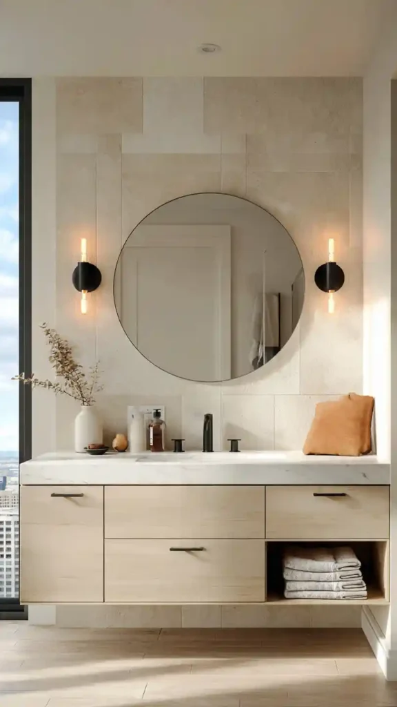 In a modern bathroom, lighting works best when it feels simple and balanced. Two slim matte black wall sconces placed on each side of a round mirror create clean, even lighting across the vanity. This setup works especially well above a floating vanity with light wood drawers and a white quartz countertop.
