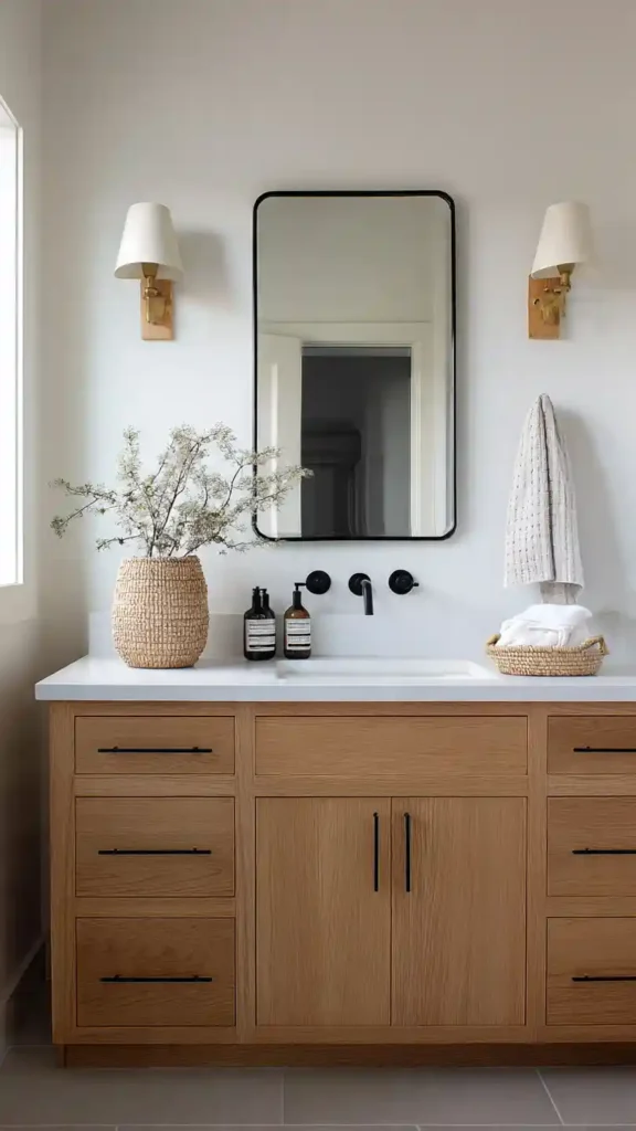 Installed beside a mirror above a light oak vanity, the wood detail helps warm up the bathroom while the metal shade keeps the design simple and modern. Paired with white walls, soft lighting, and minimal decor, this style creates a calm and airy atmosphere.