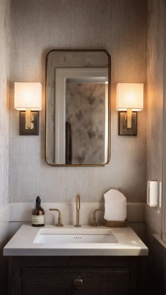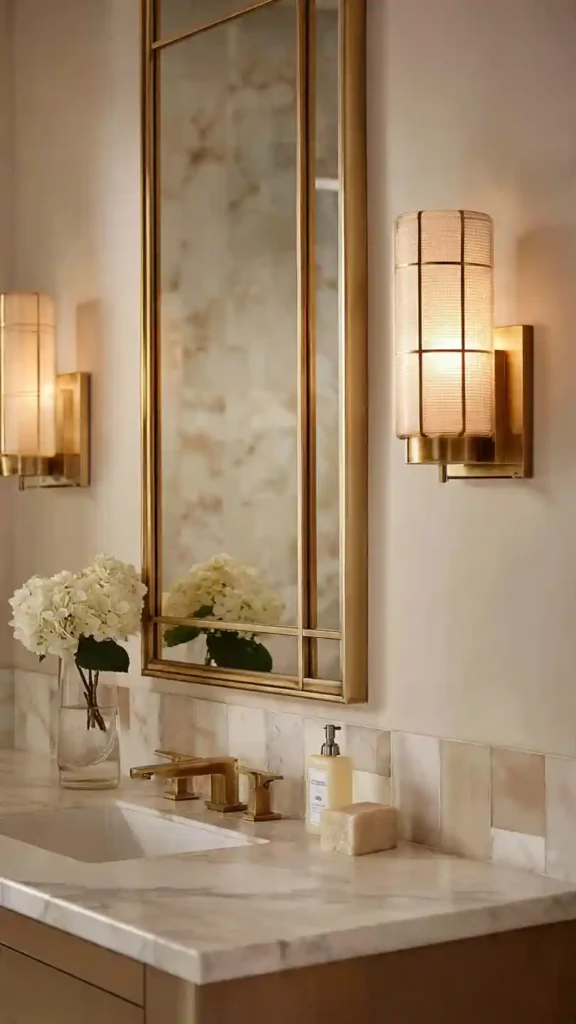 Brass sconces can instantly warm up a bathroom that uses cooler materials like marble or light stone tiles. When placed beside a large rectangular mirror, the golden finish gently reflects the light, creating a soft glow across the vanity area.