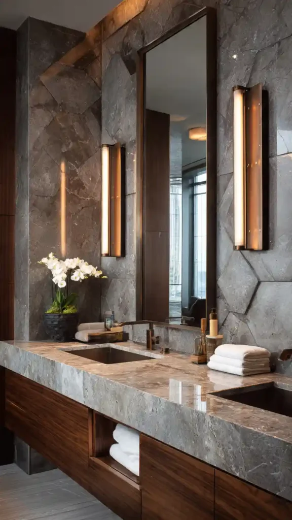 This style works especially well in bathrooms with wood cabinets, stone countertops, or textured wall tiles. The warm lighting highlights natural materials and helps the space feel comfortable rather than overly polished.
