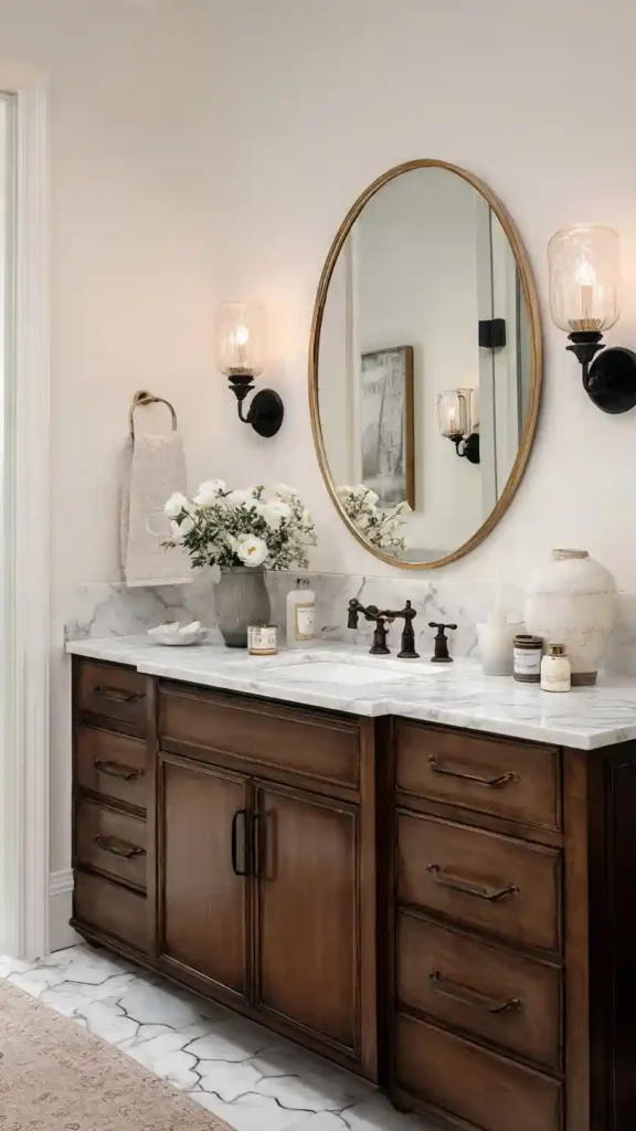 Vintage bronze sconces bring a timeless look that works beautifully in traditional bathrooms. The curved metal arms and glass shades add a bit of elegance without feeling overly decorative.