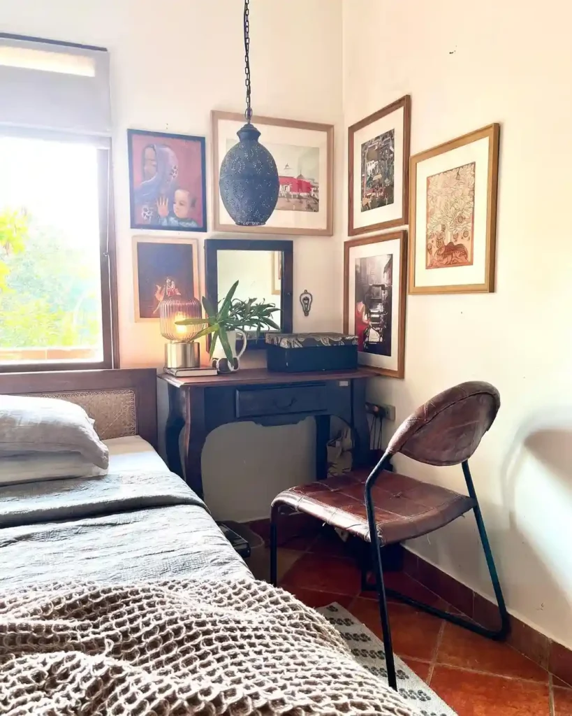 This corner feels creative and personal. The mix of framed art around the desk creates a soft gallery effect, while the warm lighting from the lamp makes the space feel inviting. The chair adds a slightly rustic touch, and the nearby bed keeps everything connected.