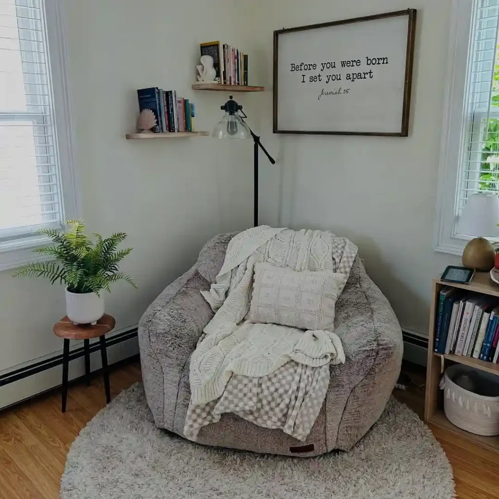 This corner is small, but it feels complete. The armchair, knit pouf, and soft throw create a comfortable setup that’s perfect for relaxing. A small side table and personal touches make it feel lived-in, not staged.