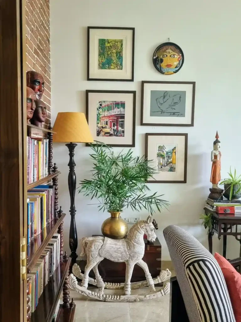 This corner has personality in every detail. From the carved rocking horse to the layered artwork and books, everything feels collected rather than styled in one go. The plant adds freshness, while the mix of textures wood, metal, fabric keeps your eyes moving.