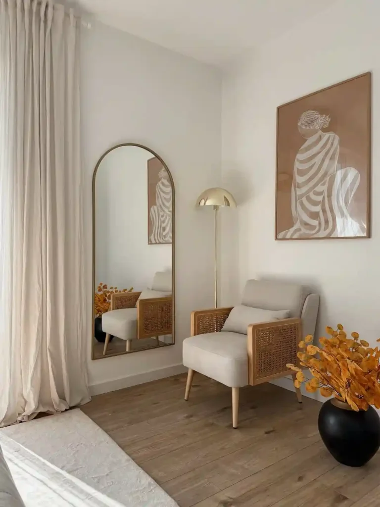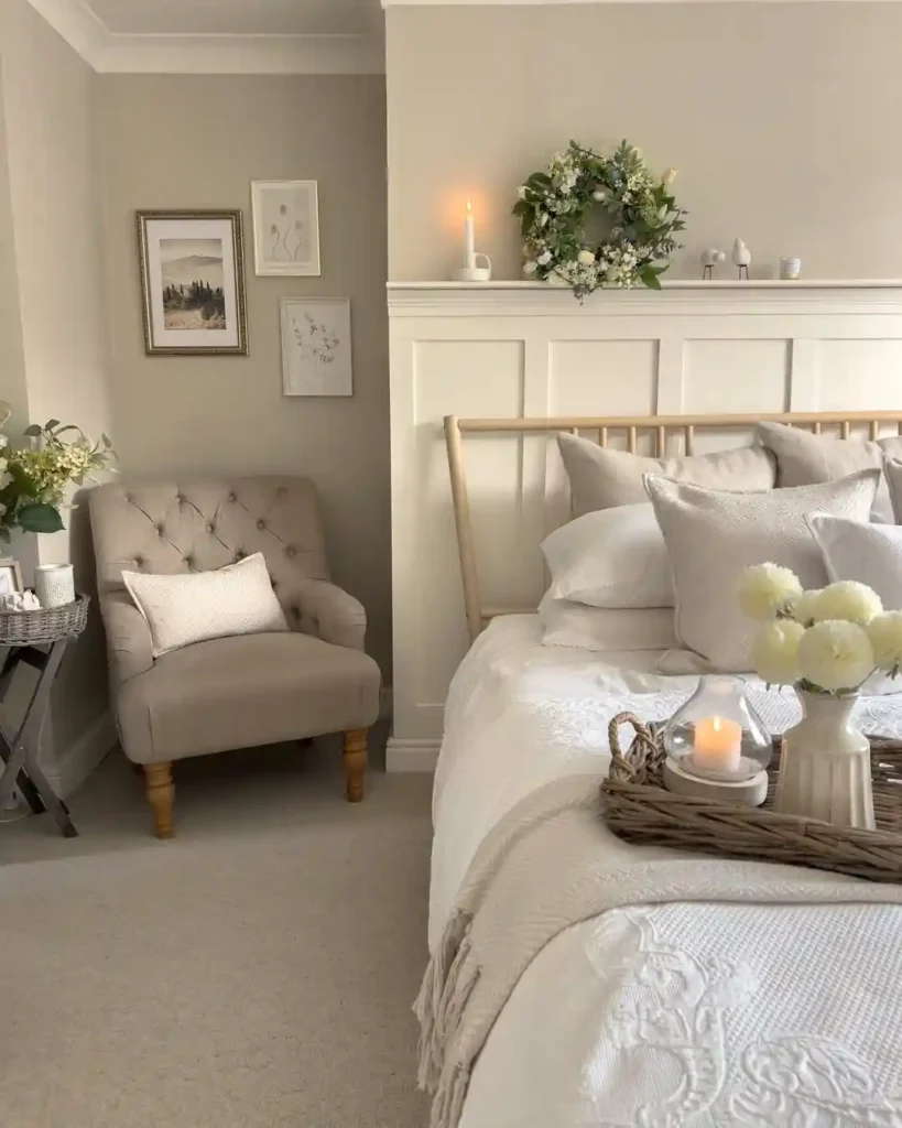 This corner feels timeless and calm. The soft armchair, neutral bedding, and subtle decor create a peaceful space that blends into the bedroom without disappearing. Everything feels gentle and cohesive.