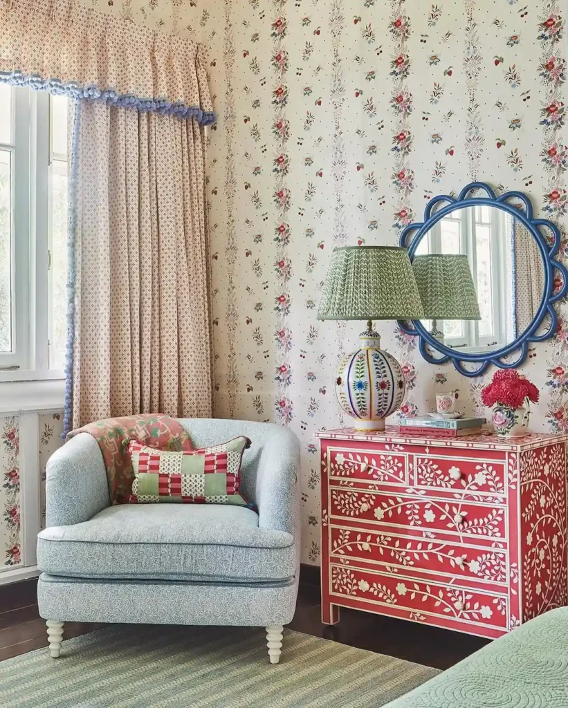This corner is proof that bedrooms don’t have to stay neutral to feel cozy. The floral wallpaper adds movement and charm, while the painted dresser becomes the star of the space. The soft armchair pulls everything together and makes the corner actually usable.