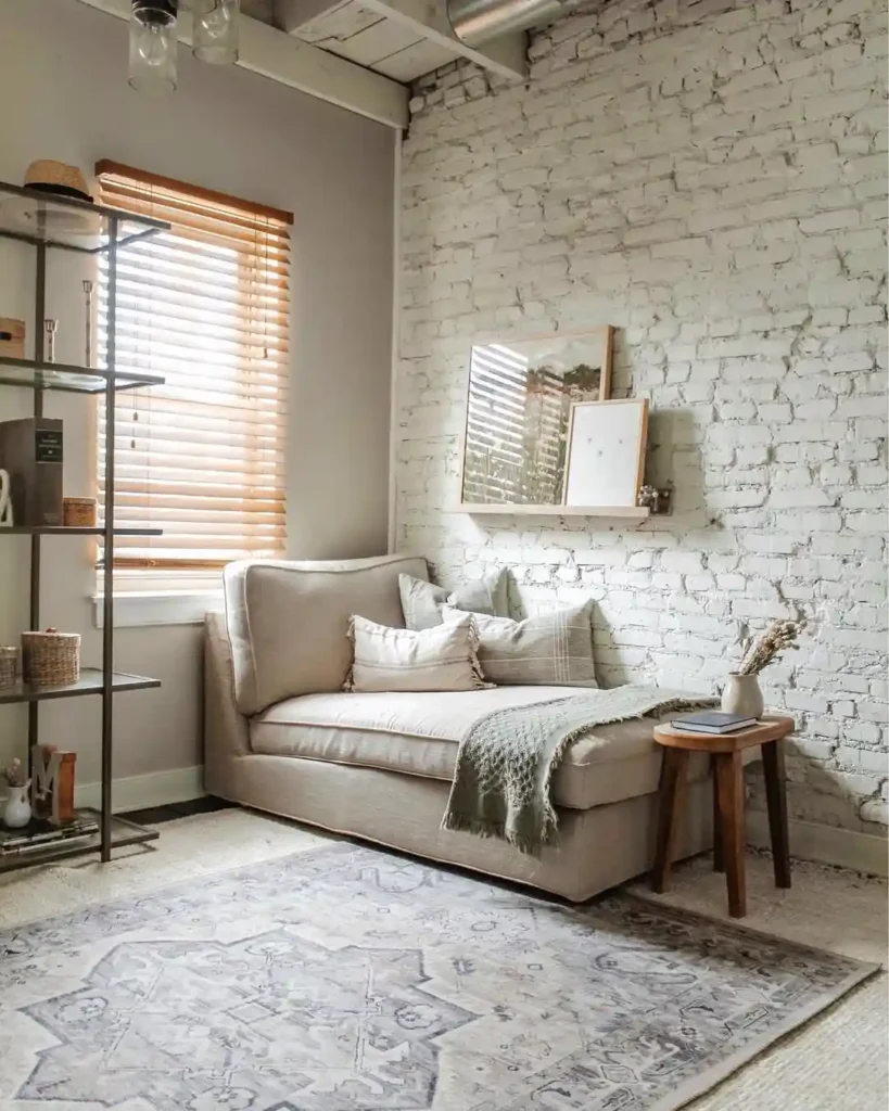 This corner has that calm, slightly rustic feel that instantly makes you want to slow down. The textured brick wall adds character, while the soft lounge seat and layered pillows keep it comfortable. A small stool and open shelving nearby make it practical without cluttering the space.