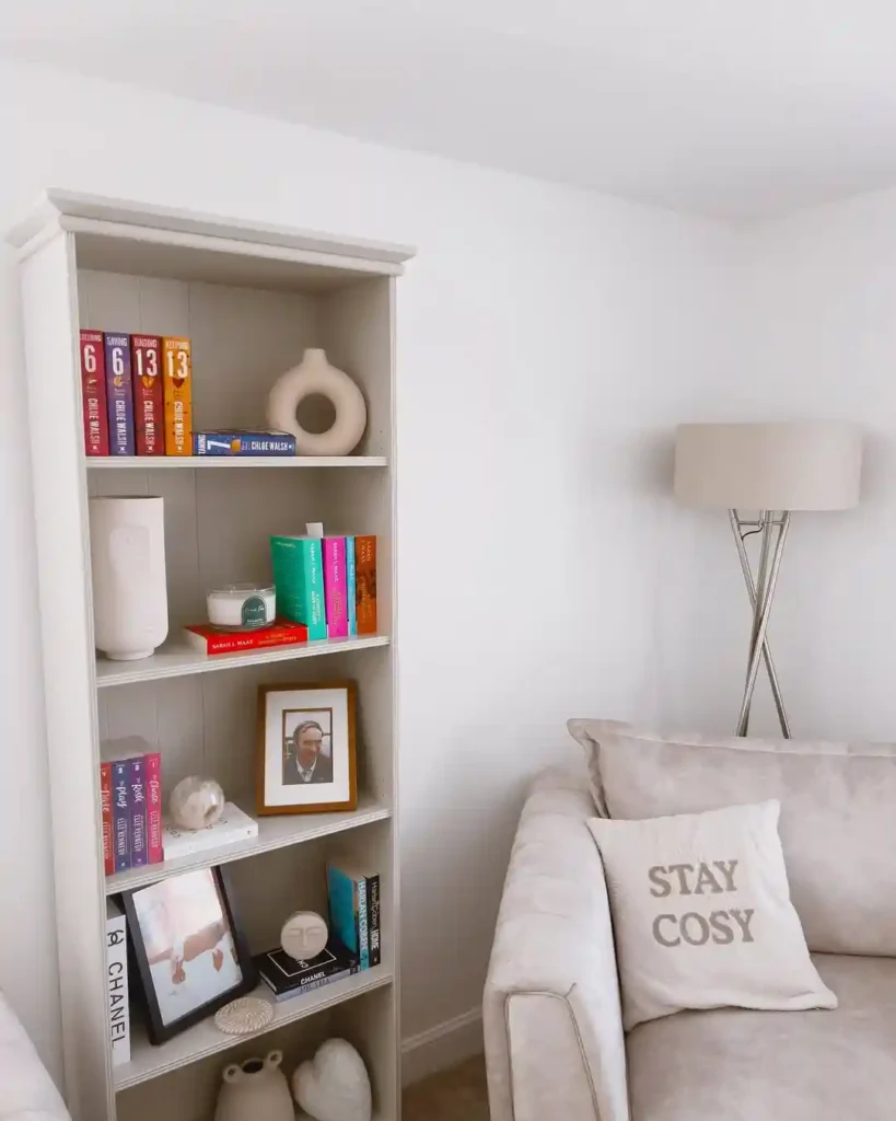 This corner proves you don’t need much to make a space feel complete. A small bookshelf, soft seating, and a few personal items create a cozy, functional setup. The neutral tones keep it calm, while books add personality.