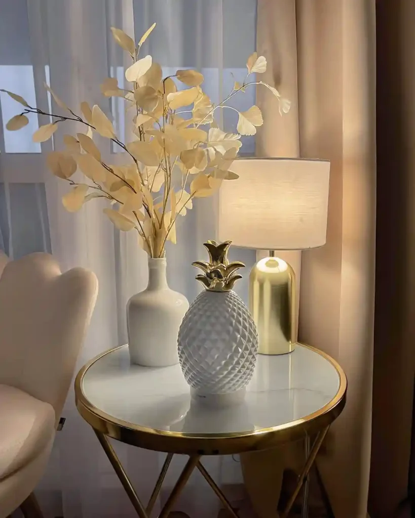 This corner feels warm, calm, and a little luxurious. The gold lamp paired with soft curtains creates that evening glow you usually only get in boutique hotels. The small round table keeps everything compact, while the layered decor vase, statement object adds quiet detail.