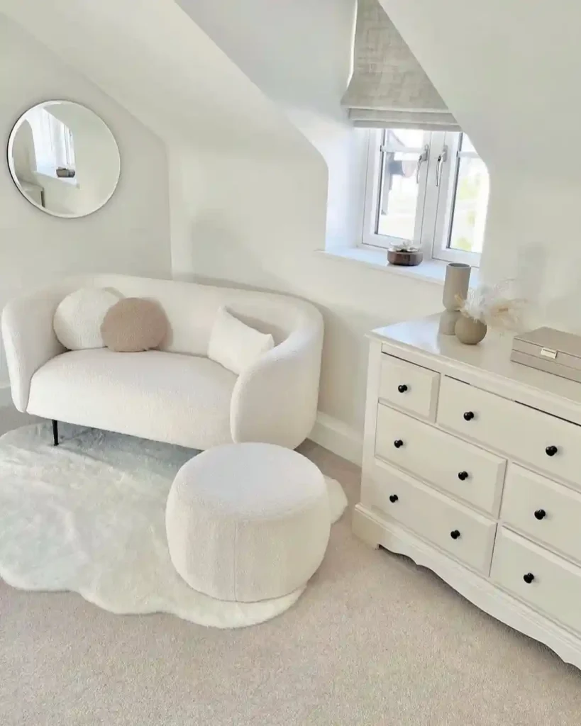 This corner feels calm, clean, and very easy to live with. The curved sofa and soft textures make it inviting, while the neutral palette keeps everything light. The dresser and minimal decor add just enough detail without cluttering the space.