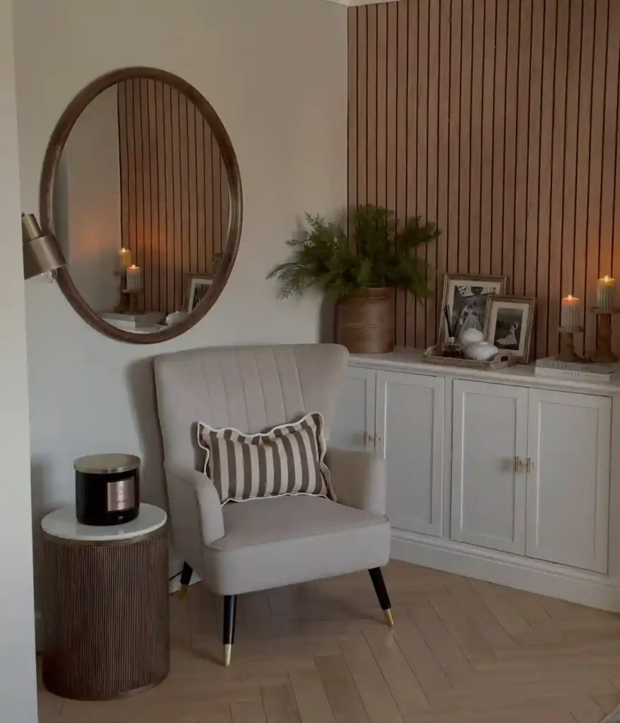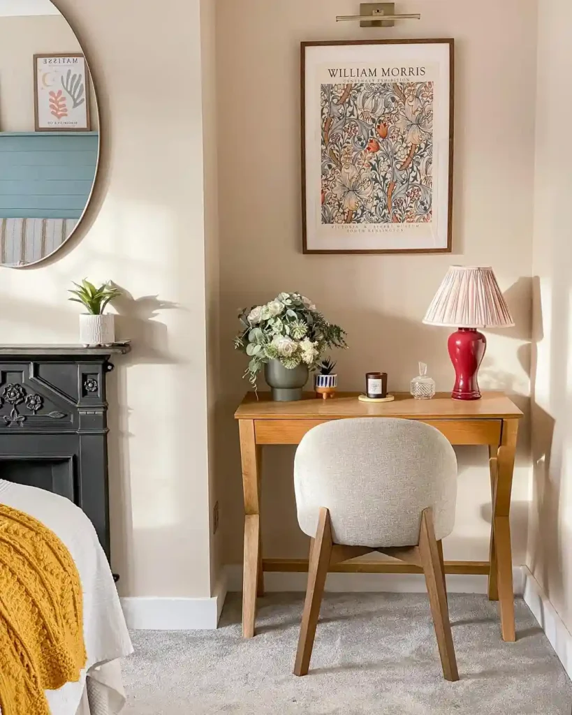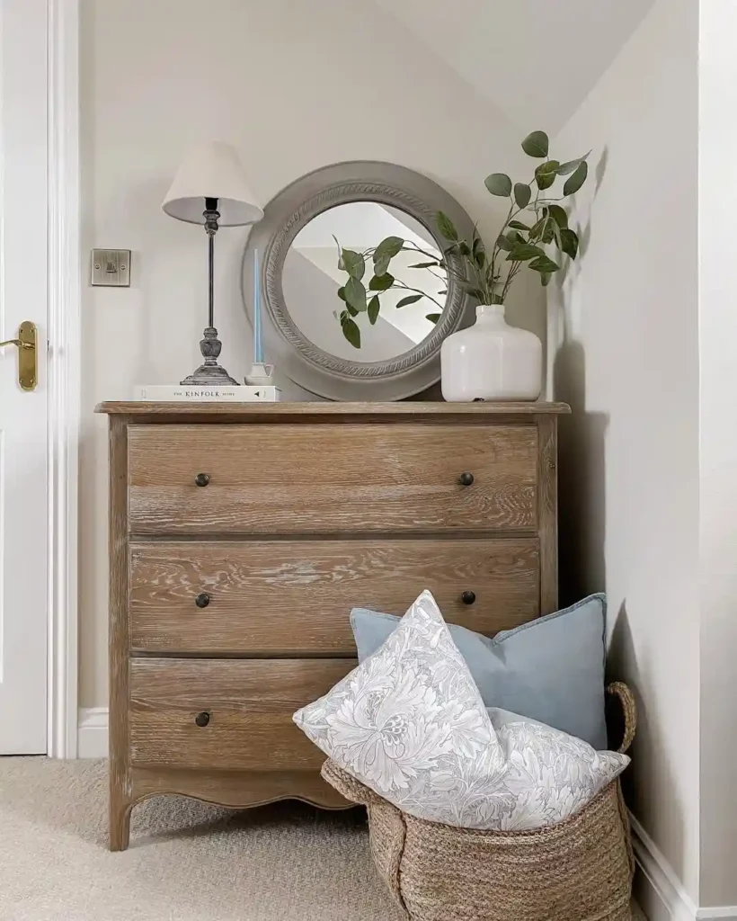 This corner has that calm, slow-morning vibe. The warm wood dresser grounds the space, while the round mirror softens everything visually. A simple lamp adds gentle lighting, and the greenery brings just enough life without cluttering the surface.