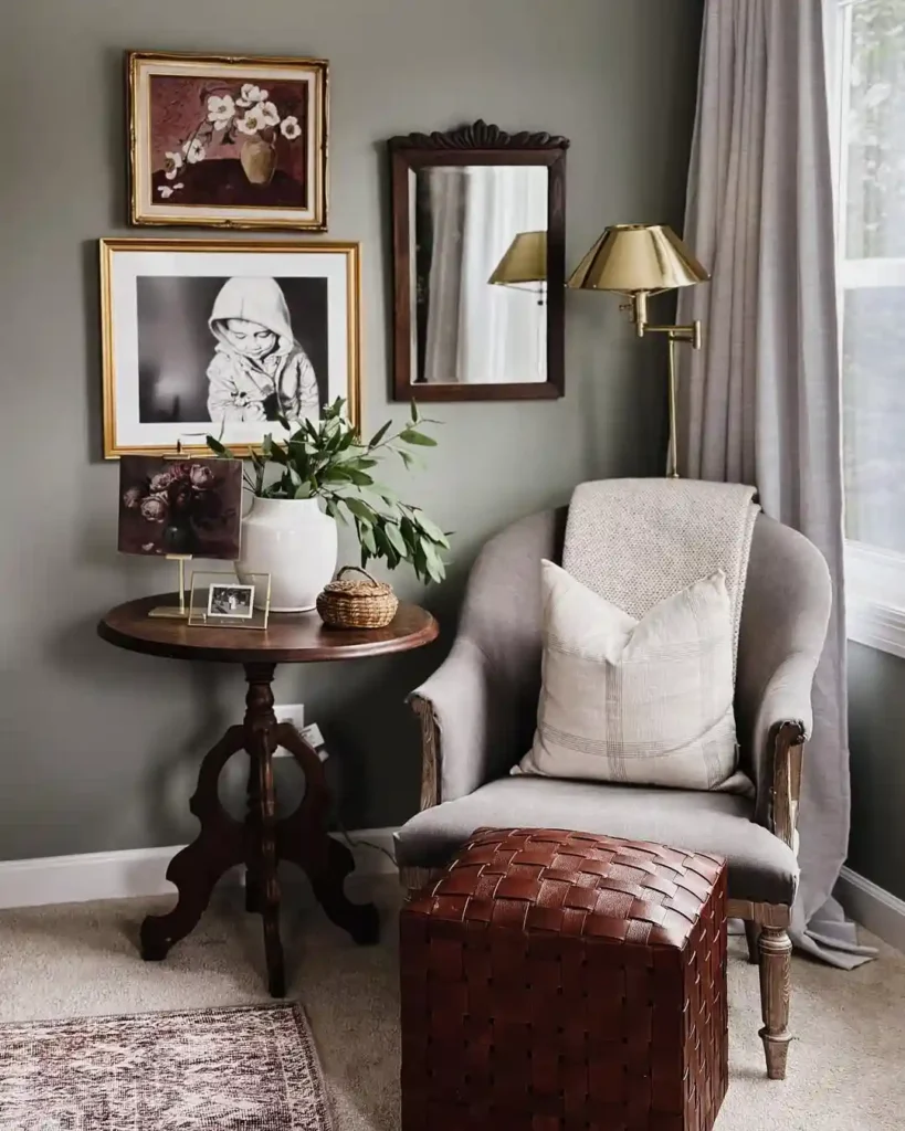 This corner feels like it tells a story. The mix of framed art in different sizes creates a relaxed gallery wall that doesn’t feel too perfect. A soft armchair paired with a small wooden table makes the space comfortable, while the warm tones from the frames and textiles keep everything cohesive.