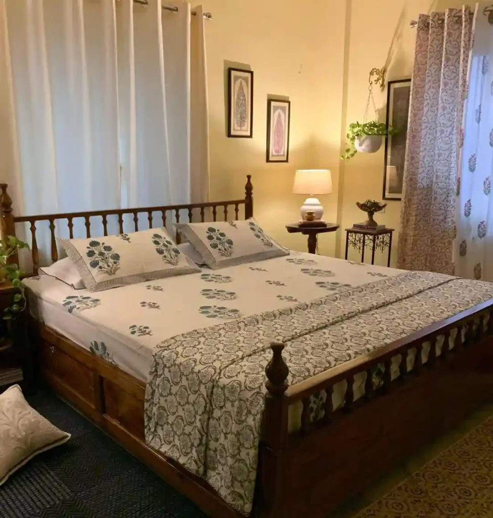 This corner feels grounded and peaceful. The wooden bed, soft textiles, and warm lighting create a space that feels comfortable at any time of day. Small decor touches like plants and side tables add life without overwhelming the room.