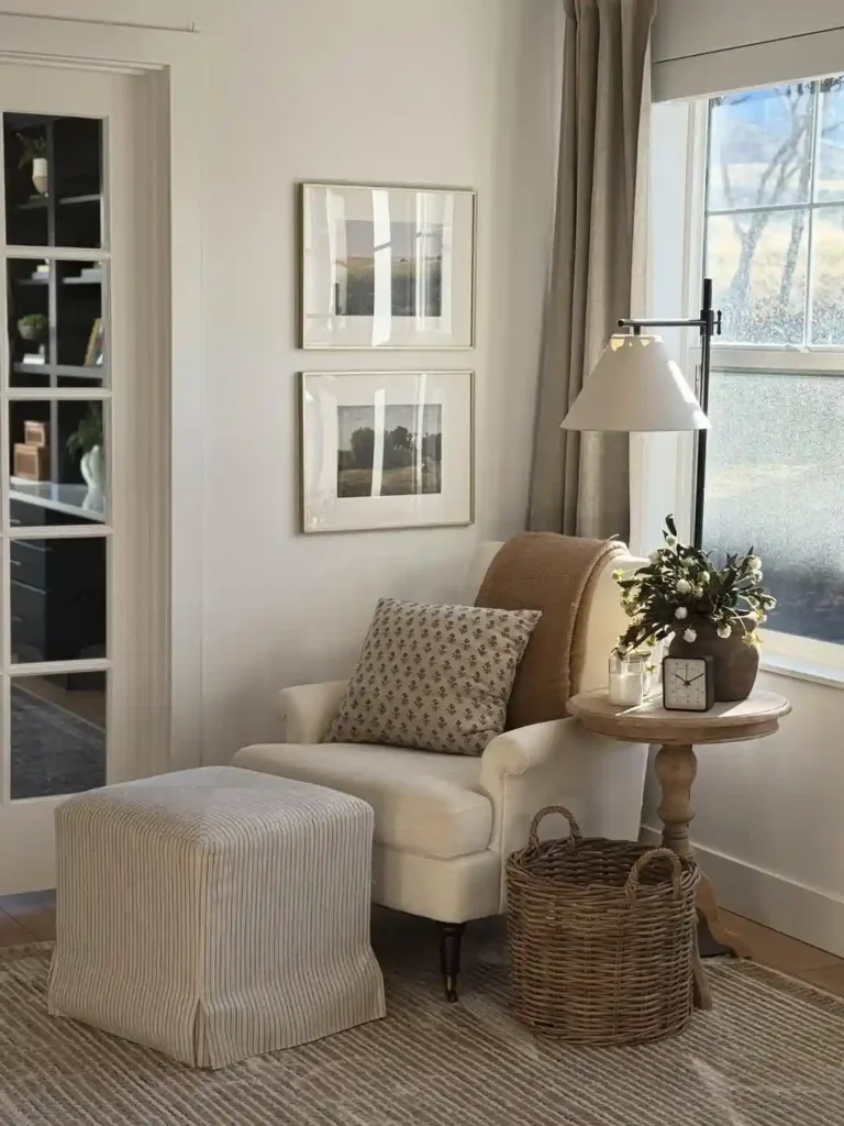 This corner feels gentle and cozy without being overly styled. The blush-toned seating adds warmth, while the wall art and soft lighting create a relaxed mood. The fringe detail and small table bring in subtle texture that makes the space feel layered.
