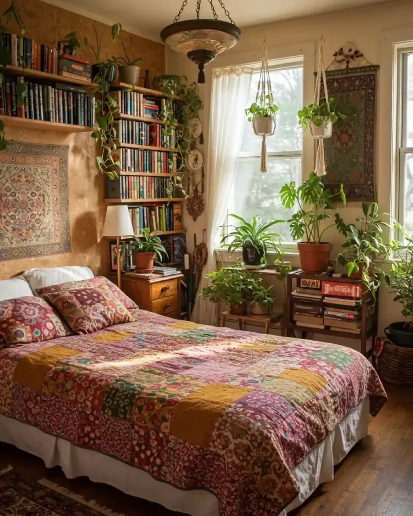 This cozy Boho retreat feels alive with personality. A patchwork quilt adds a burst of color to the bed, while overflowing bookshelves and hanging plants create a warm, collected look. Sunlight filters through sheer curtains, making the room feel vibrant yet homey. The blend of books, greenery, and textiles gives it a lived-in charm.