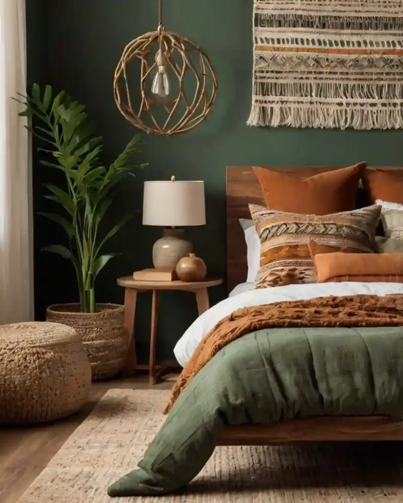 This Boho bedroom feels grounding and bold with a deep forest-green wall as its backdrop. Layered earthy bedding in olive and rust tones pairs with patterned cushions for a cozy, autumn-inspired vibe. A woven pendant light and macramé wall hanging add movement, while large potted plants enhance the natural energy. The mix of textures creates a rich, organic retreat.