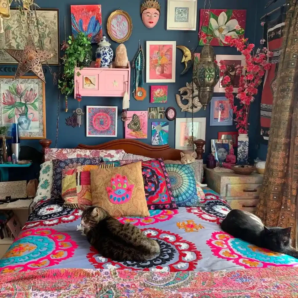 This Boho bedroom is full of vibrant energy with layered quilts, embroidered pillows, and playful artwork. The deep teal walls provide a rich backdrop for an eclectic gallery featuring masks, florals, and lanterns. Cats lounging on the bed only make it feel cozier and lived-in. The overall effect is joyful, free-spirited, and unapologetically bold.