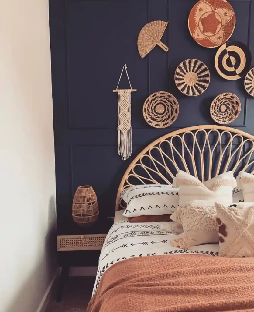 A bold navy wall makes this Boho bedroom feel striking and moody. A rattan headboard and earthy terracotta blanket warm up the space, while the woven basket gallery adds texture and cultural flair. Macramé accents and a cane lamp tie everything together, creating a look that’s both dramatic and welcoming.