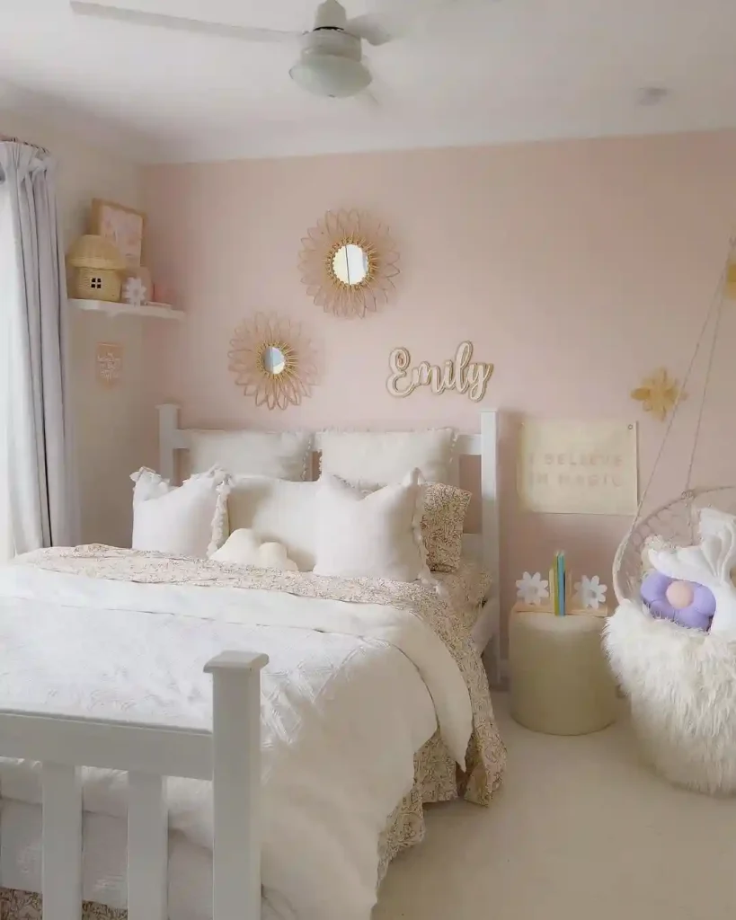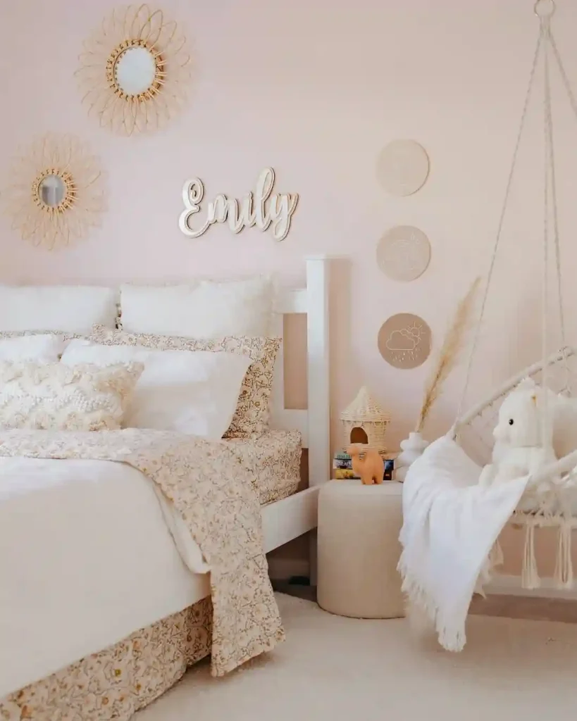 This space balances light blush tones with cozy layers of cream bedding. Playful accents like round woven mirrors, a hanging chair, and whimsical wall art give it a cheerful and youthful vibe. Soft curtains allow natural light to keep everything bright and soothing.