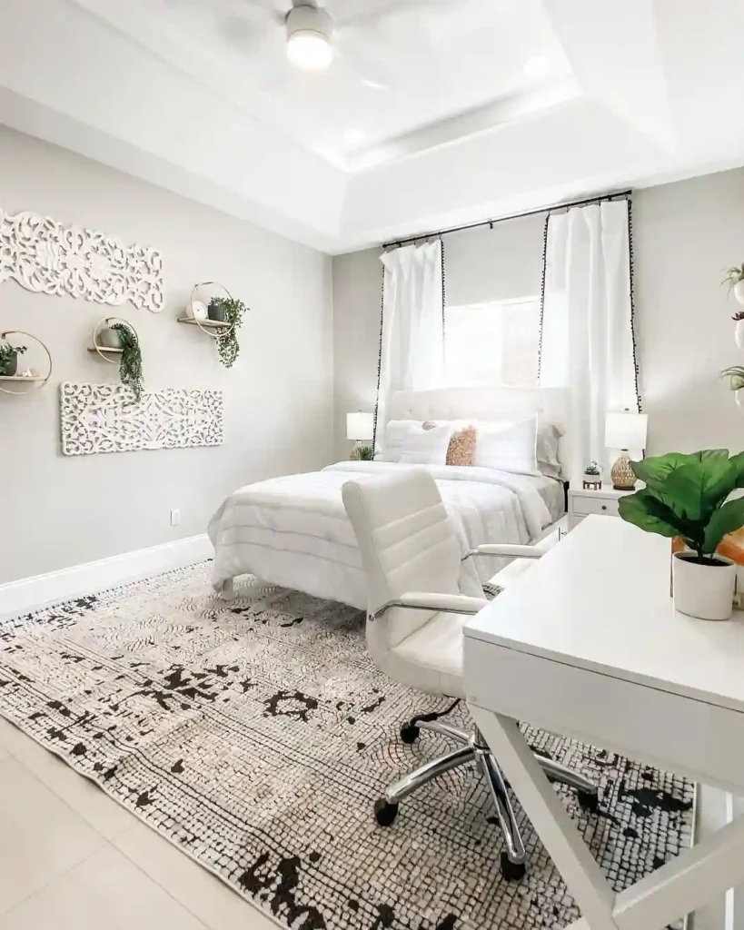 Here’s a softer, minimal take on Boho style. White walls, sheer curtains, and a patterned rug create a crisp foundation, while greenery adds life to the space. Carved wall art and woven baskets introduce texture without overpowering the airy atmosphere. A white desk and chair show that Boho can blend seamlessly with a work-from-home setup too.