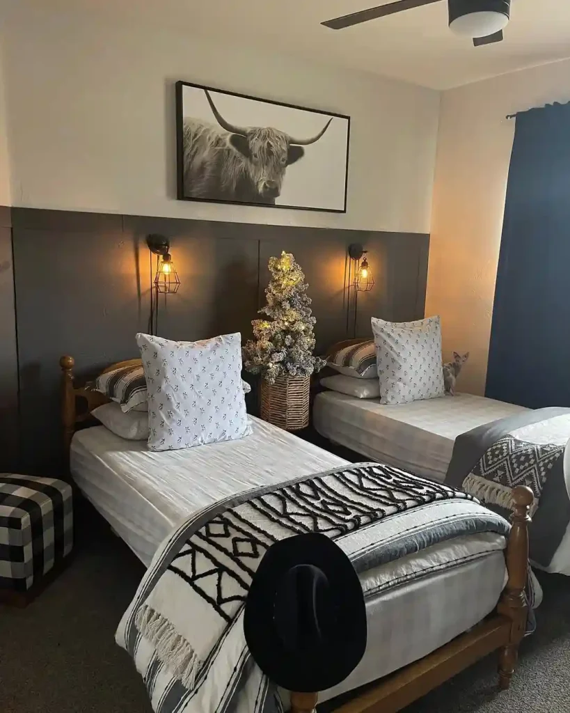 This twin setup shows Boho doesn’t always have to mean color overload. Black, white, and gray textiles with tribal patterns keep the vibe stylish yet grounded. Rustic wood frames, plaid stools, and industrial lamps add a touch of modern farmhouse while staying cozy.
