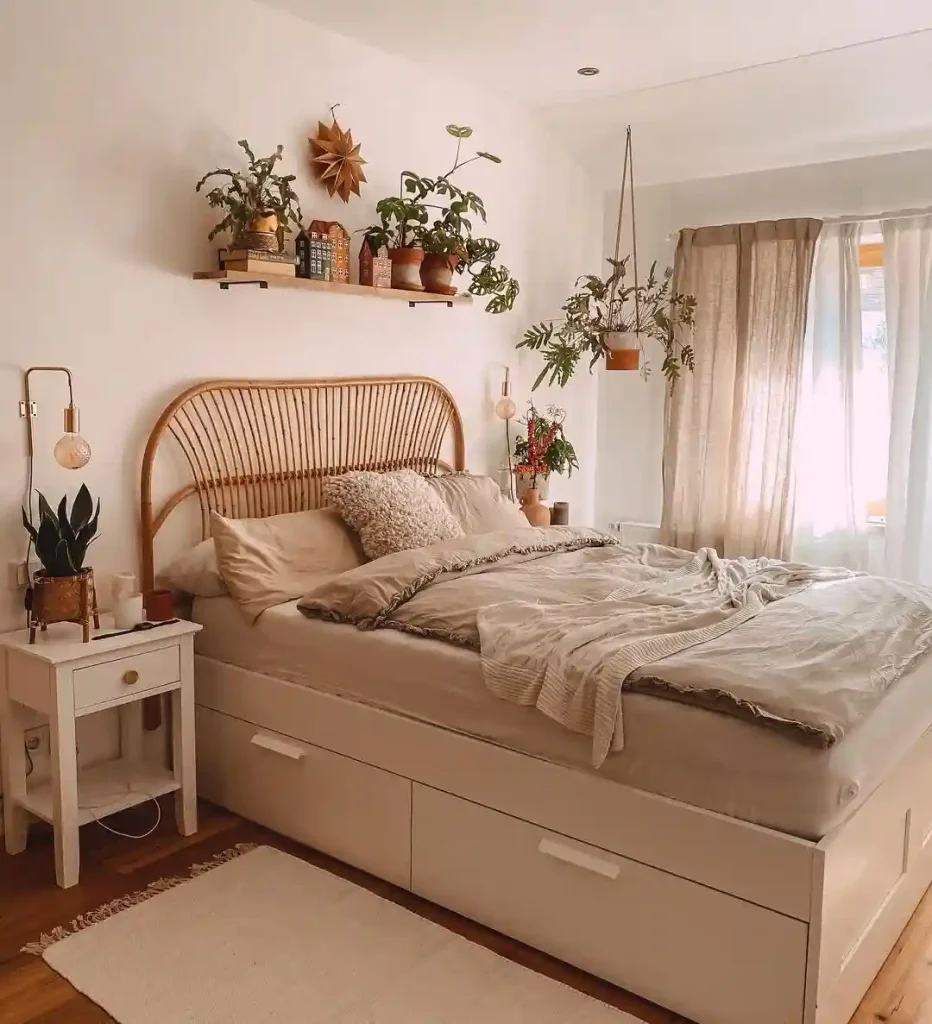 This bedroom celebrates greenery. A rattan headboard and natural linen bedding set the base, while shelves and hanging planters overflow with plants. The neutral palette keeps things calm while the greenery adds freshness and life.