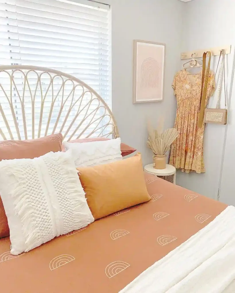 This bedroom feels light and playful with rust-colored bedding and a rattan headboard. A simple rainbow wall print adds a retro twist, while hanging baskets and pampas grass keep things natural. A floral dress on the wall hook doubles as both décor and personality.