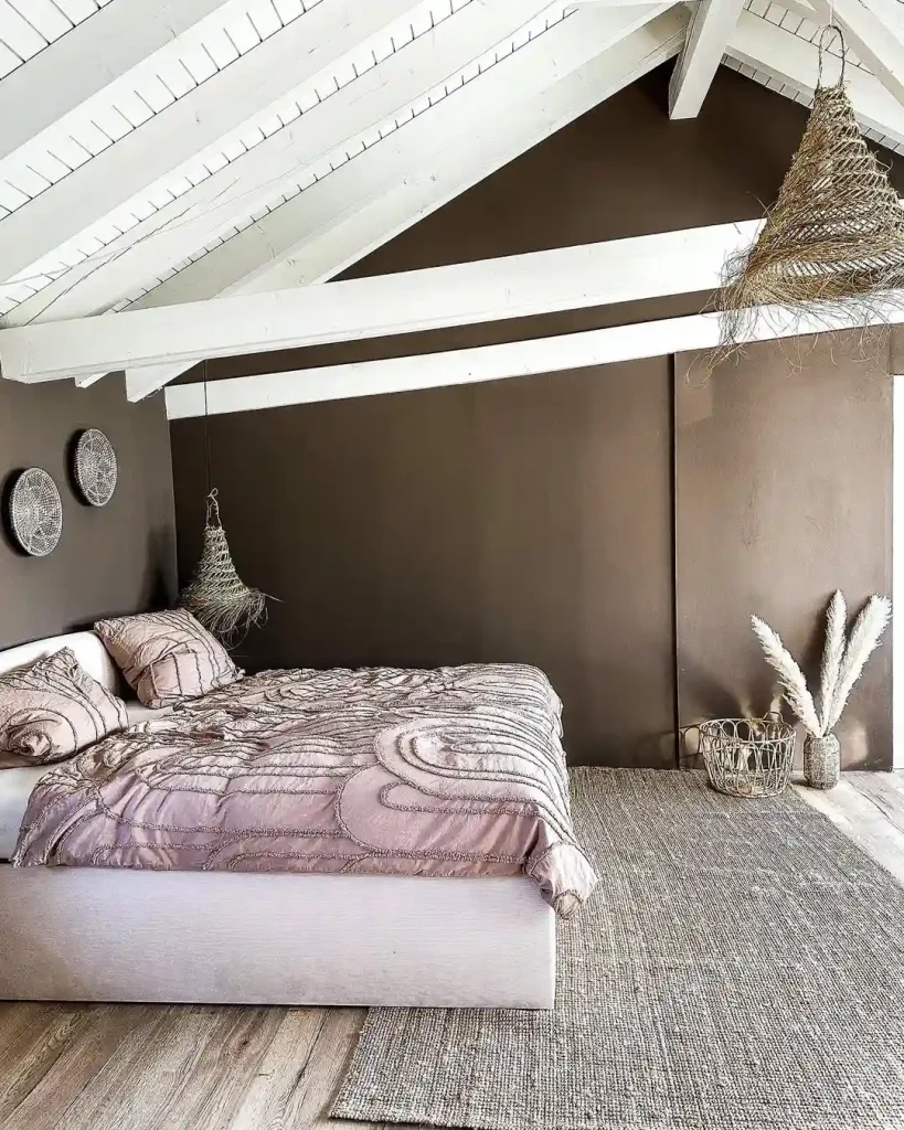 Set under white wooden beams, this loft bedroom is filled with rustic Boho charm. A muted mauve bedspread with textured embroidery pairs with woven baskets and pampas grass. The earthy tones of the walls and rug keep the room grounded in a natural, calming palette.