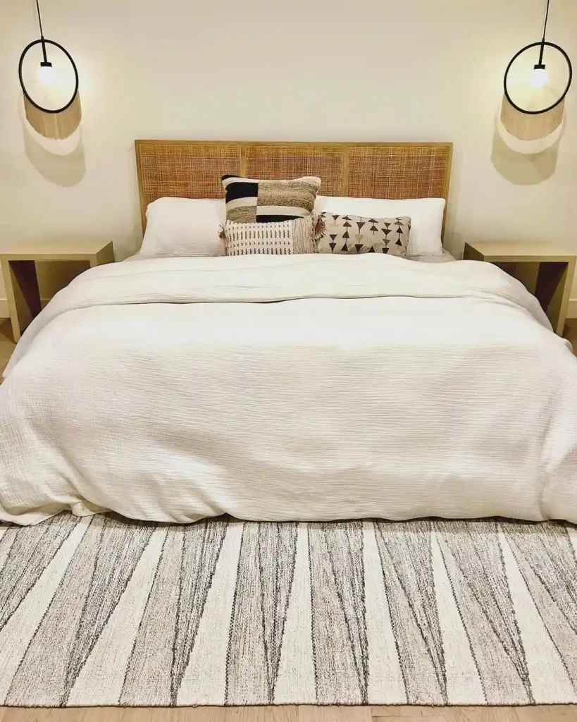 Simplicity is key here. A clean bedspread pairs with a rattan headboard and patterned pillows for subtle Boho flair. Modern pendant lights with fringed shades add character without cluttering the design. A striped rug beneath the bed ties everything together in a calm, balanced way.