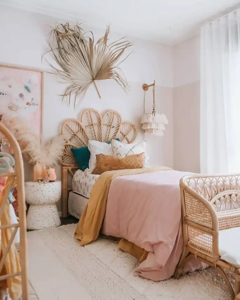 Here, soft blush bedding pairs beautifully with rattan furniture for a gentle, feminine Boho look. A peacock-style headboard and palm wall décor make the space unique, while pampas grass in a vase brings softness and texture. Layered throws in mustard and pink add warmth without overwhelming the airy atmosphere.