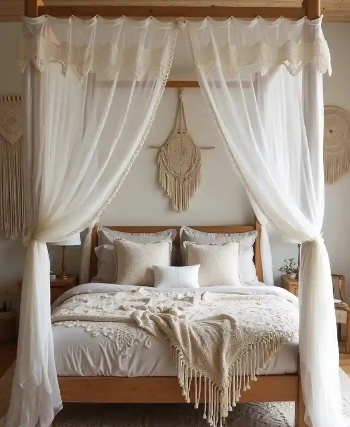 This dreamy Boho bedroom embraces lightness and flow. A four-poster wooden bed draped in airy white curtains instantly sets a calming, romantic mood. Cream macramé accents and soft woven throws add texture without overwhelming the space. Everything feels grounded yet ethereal, perfect for unwinding at the end of the day.