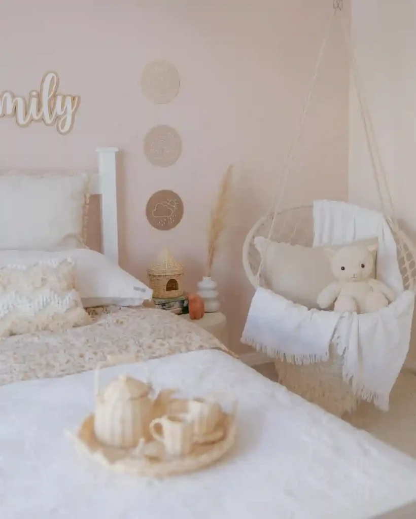 This dreamy room combines pastel pink walls with cream bedding for a gentle, nurturing vibe. A hanging macramé chair with fluffy cushions makes the perfect cozy corner. Natural details like pampas grass and woven baskets keep it grounded while still feeling whimsical.