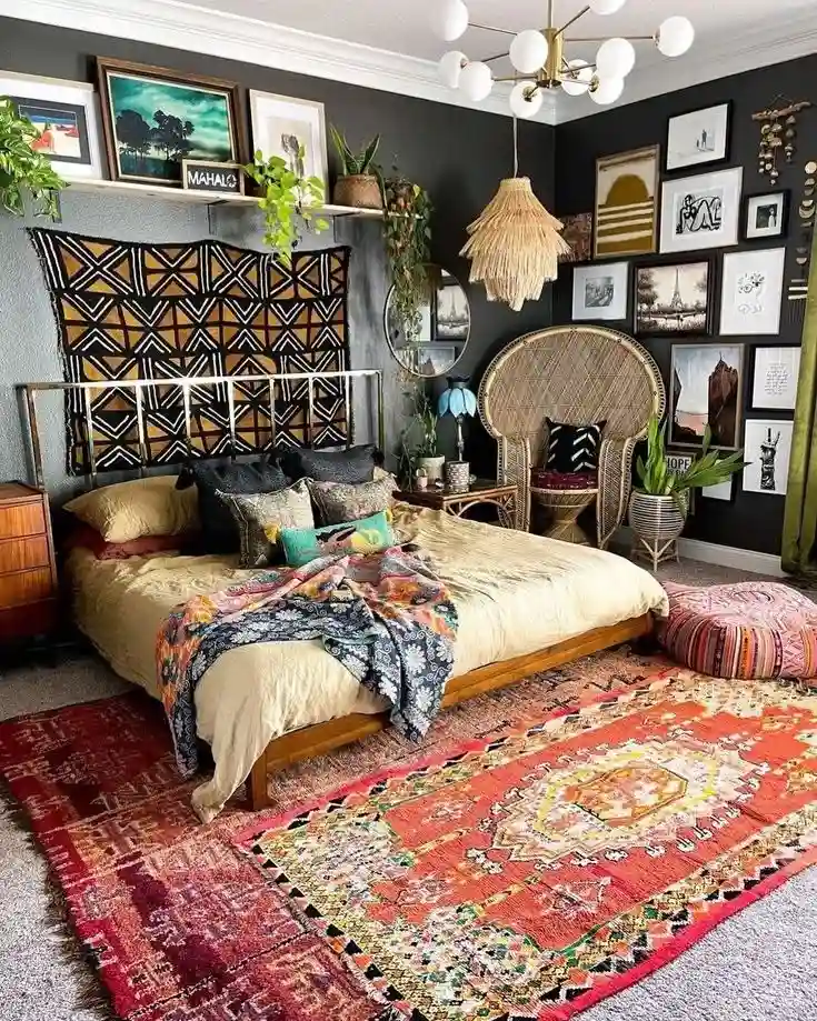 This bold Boho bedroom is full of personality. The deep charcoal walls make the patterned textiles pop, while the layered Moroccan rugs add warmth and texture underfoot. A rattan chair and hanging fringe lamp bring natural balance to the bold art prints filling the gallery wall. The bed itself feels cozy with colorful throws and mismatched pillows, creating a collected and relaxed look.