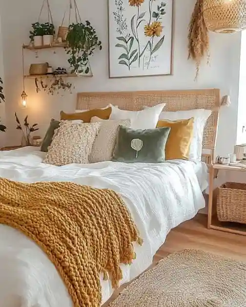 Sunny yellow tones paired with earthy greens make this bedroom bright and cozy. The woven headboard, wicker baskets, and hanging plants bring a natural touch, while botanical wall art ties the whole space together. A chunky knit mustard blanket adds depth and comfort, keeping the vibe cheerful yet relaxed.