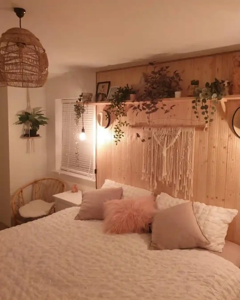 This bedroom feels instantly cozy thanks to the natural wood paneling behind the bed. Layered pink and cream pillows soften the look, while a fluffy accent cushion adds a playful touch. Hanging plants and macramé wall art bring in earthy detail, and the woven pendant light warms the whole space.