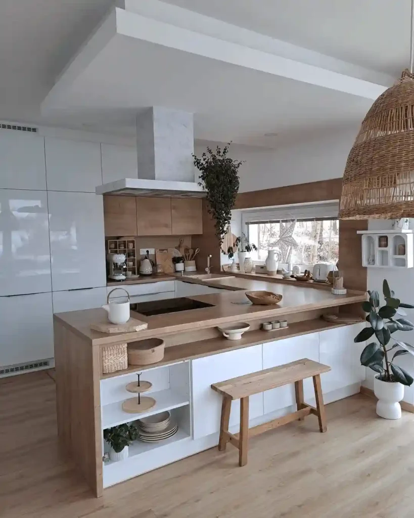 This bright kitchen uses natural wood, white cabinets, and soft greenery to create a relaxed, earthy vibe. The open shelving under the island keeps things casual, while a small wooden bench invites you to slow down. Simple ceramics, a trailing plant, and bamboo accents pull everything together. It’s a peaceful space that feels grounded and airy at the same time—a great example of how natural textures and open design can make your kitchen feel like a retreat.