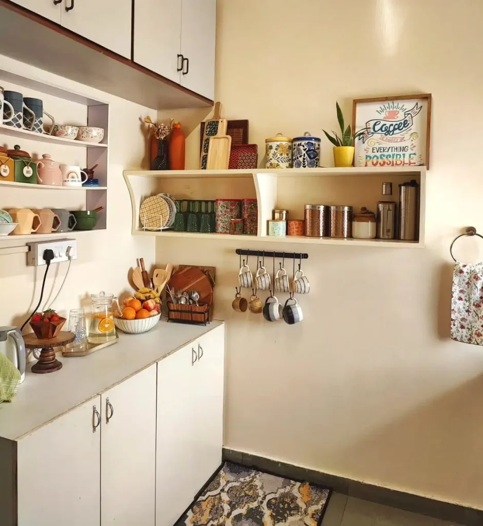 This charming little corner gives all the cozy feels. With open shelves, basket decor, and a mix of natural woods and whites, it blends boho with a hint of farmhouse style. The mini coffee station is both functional and adorable, with wall hooks and mini greenery adding warmth. And that sunflower centerpiece? The perfect cheerful touch. It’s proof that you can carve out a boho moment even in the smallest corner of your kitchen.