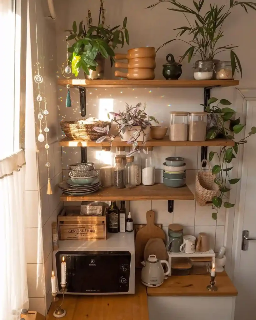 This tiny corner is full of charm. With open wooden shelves, earthy pottery, woven baskets, and jars of dry goods, it turns storage into style. The plants bring a fresh, relaxed energy, while little touches like hanging crystals and soft candlelight make it feel magical. It proves that even a small corner can pack a lot of warmth and personality with natural textures and soft golden light.