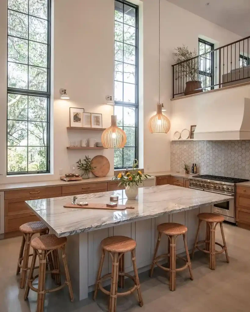 Talk about kitchen goals—this one is all about light, height, and clean design. The tall black windows flood the space with natural light, while rattan bar stools and simple wooden shelves soften the bold lines. A big marble island becomes the heart of the room, perfect for meals or just hanging out. With soft pendant lights and minimal yet cozy decor, this space feels fresh, open, and beautifully balanced with a modern boho twist.