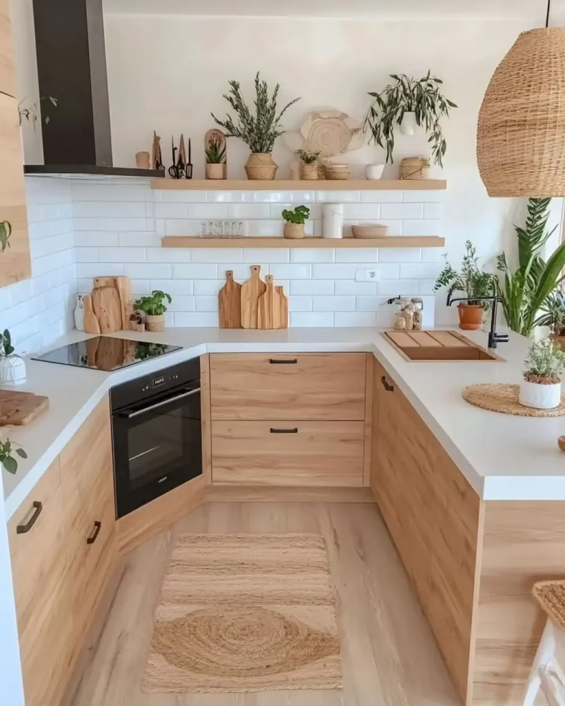This kitchen has that perfect clean-boho mix. The white subway tiles, brass tap, and open wood shelves bring in modern charm, while the vintage rug on the floor adds cozy personality. A few potted plants and woven textures soften the look, making the space feel welcoming, not sterile. It’s the kind of kitchen that feels both fresh and lived-in—a little modern, a little rustic, and totally inviting.