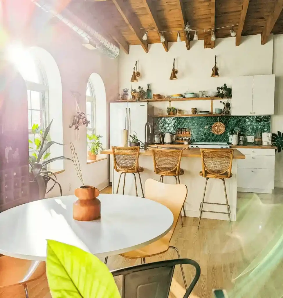 This sun-drenched kitchen feels alive with its green tile backsplash and golden sunlight pouring in from arched windows. The woven bar stools, brass fixtures, and hanging plants give it that airy boho feel. Wooden ceiling beams add character, and a round white table keeps it casual for morning coffee or chats. It’s playful yet peaceful—a great example of how mixing textures and natural light can instantly warm up your kitchen.