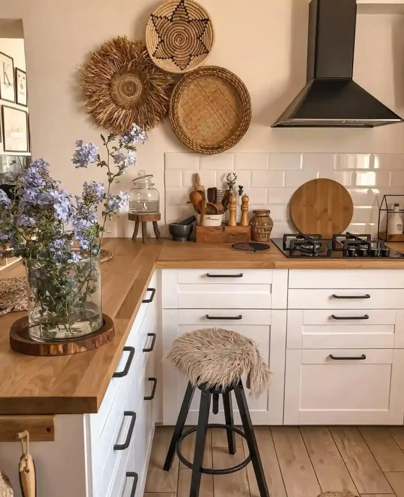 This cozy kitchen mixes natural wood with white cabinetry for a clean but warm look. Woven wall baskets add texture and that perfect boho touch. A glass vase of fresh florals brings life to the space. From the soft furry stool to the handmade feel of wooden tools, every detail adds personality. This space is a reminder that you don’t need much—just thoughtful details and earthy tones to create a calming kitchen vibe.