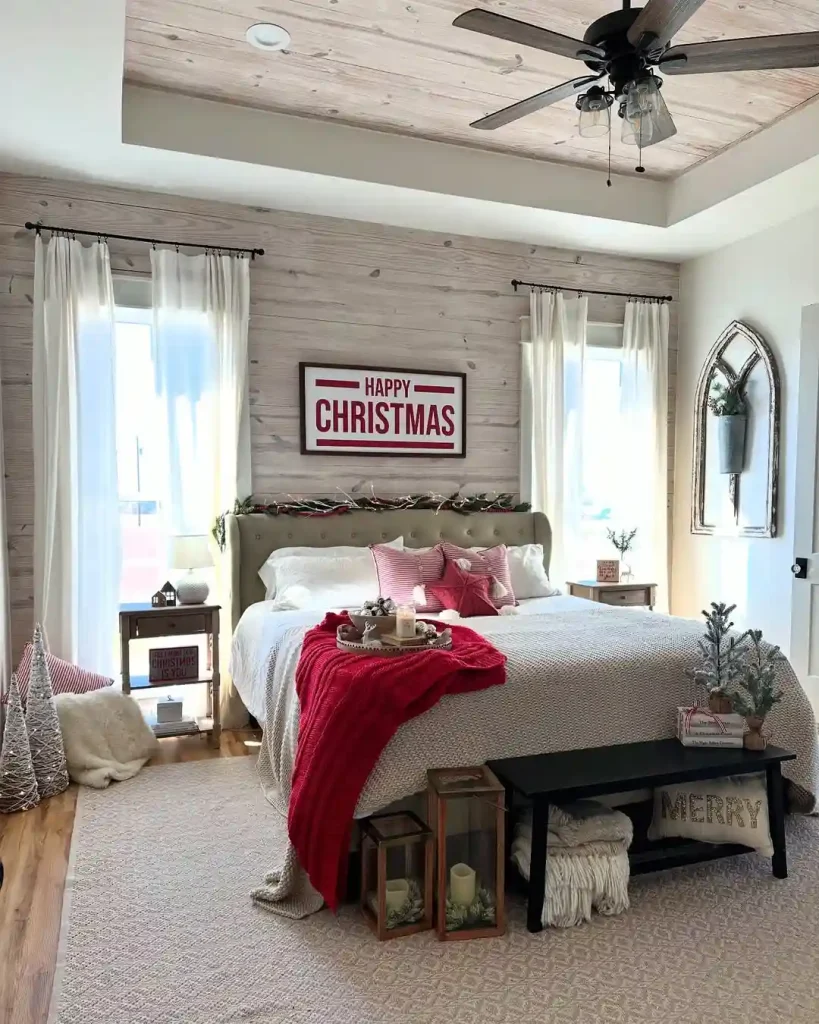 This bright bedroom bursts with cheer thanks to the bold red throw blanket and matching pillows. The “Happy Christmas” wall art sets a joyful tone, and the lanterns filled with candles add soft glow and charm. With natural wood floors and light curtains, the space feels airy yet festive — a great inspiration for anyone who loves a mix of farmhouse and holiday vibes.
