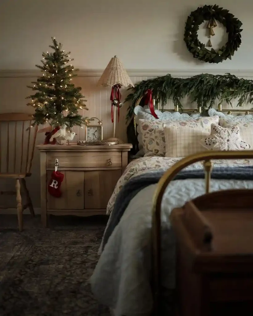 You don’t need to spend a lot to make your bedroom feel festive. Start with what you already have — add a cozy throw blanket in red or green, swap pillow covers for holiday prints, and hang a simple garland or fairy lights above the bed. Even a small Christmas tree or a few candles can instantly make your space feel warm and seasonal.