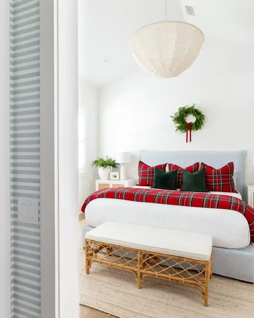 Nothing says “Christmas comfort” like red plaid bedding. This bedroom combines traditional holiday patterns with modern simplicity — crisp white walls, a pale blue headboard, and a natural woven bench that adds texture and warmth. The green wreath above the bed completes the look beautifully. It’s a timeless setup that instantly feels festive yet calm.