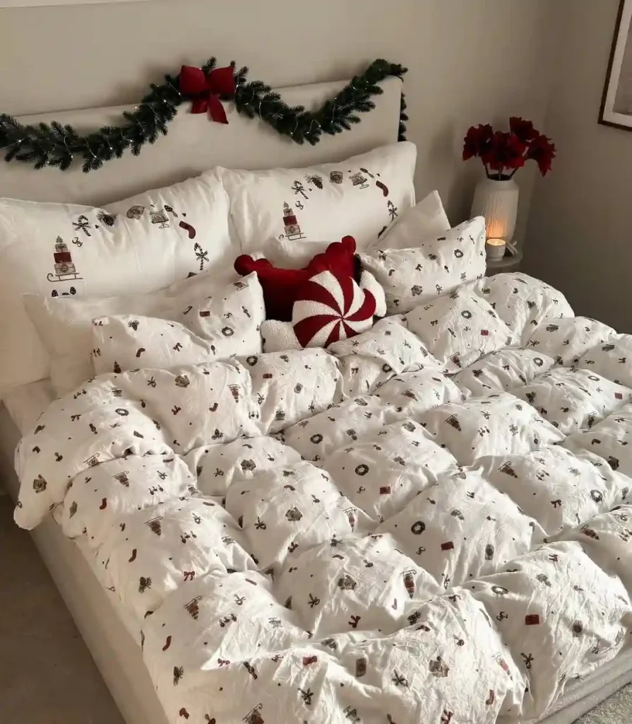 This Christmas bedroom feels soft, playful, and inviting with white bedding covered in tiny festive prints. The red-and-white peppermint pillow adds a cheerful pop that ties everything together. A simple garland draped above the bed with a red bow gives just the right amount of sparkle without overdoing it. It’s the perfect balance of cozy and fun ideal for curling up with hot cocoa and a good holiday movie.