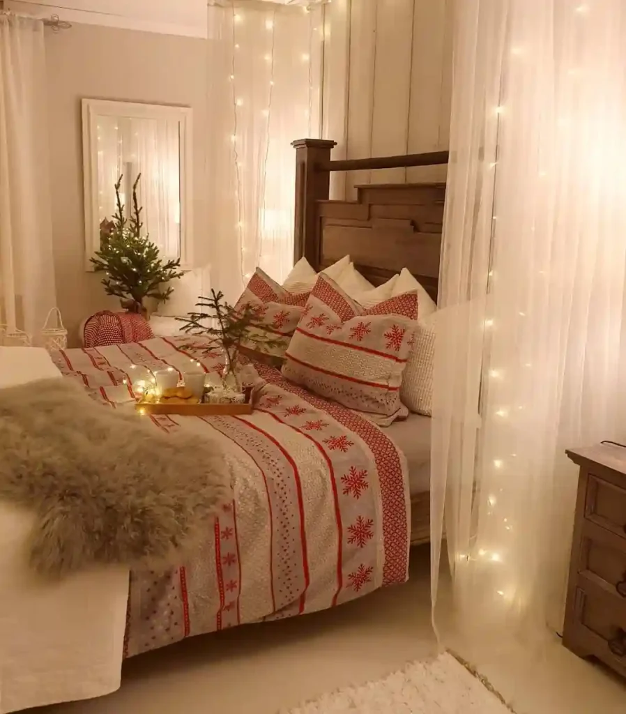 This bedroom glows like a Christmas evening by the fireplace. The golden fairy lights cascading behind sheer curtains add warmth and sparkle, while the red-and-grey snowflake bedding creates a cozy mountain-lodge atmosphere. The small tree on the nightstand brings a touch of nature indoors — perfect for those who love a soft, glowing Christmas vibe.