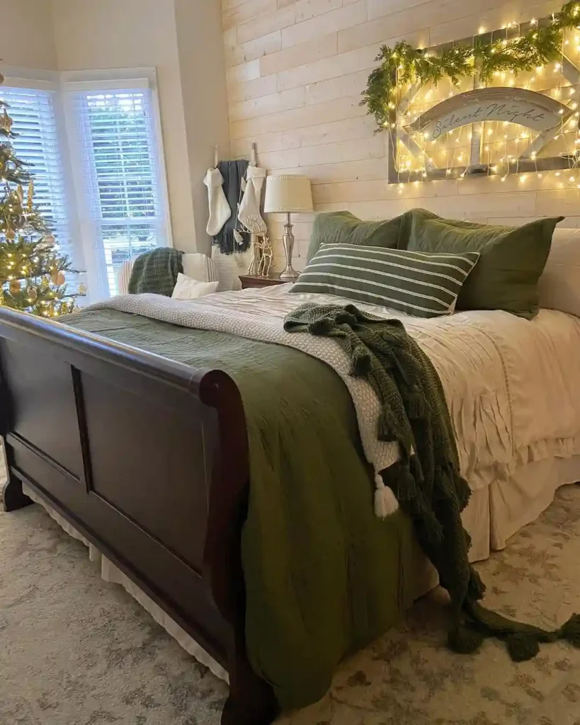 Calm and elegant, this Christmas bedroom blends forest-green bedding with warm white layers. The wood-paneled wall and string lights create a beautiful glow, especially paired with the soft shimmer of the Christmas tree nearby. Stockings and a “Silent Night” sign finish the look — cozy, serene, and full of understated charm. It’s perfect for those who love a nature-inspired holiday palette.