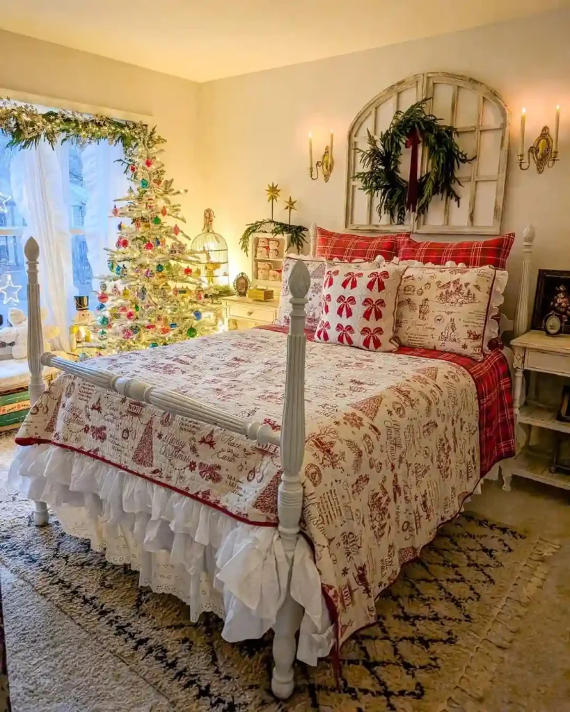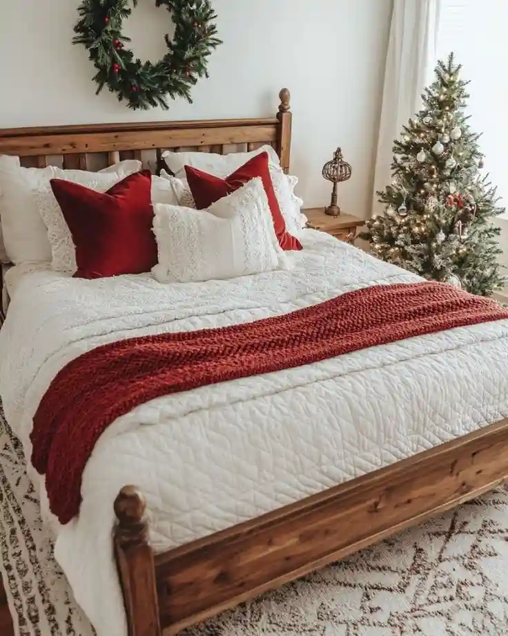 Here’s proof that simple can still be stunning. A white quilted bedspread, red knit blanket, and matching red pillows bring instant holiday warmth without overwhelming the space. The wreath above the bed and softly lit Christmas tree nearby complete the look — cozy, clean, and classic farmhouse Christmas perfection.